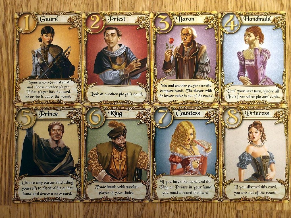 Love Letter is a simple card game about bluffing. The premise is simple: you are in love with the princess of the kingdom, and you are attempting to get your love letter to her. The single card in your hand reflects who is currently in possession of your letter, and at the end of a round the player whose letter is closest to the princess -- i.e. is of highest value -- wins a "token of affection," with whoever reaches the score goal first winning the heart of the princess and being allowed to court her.