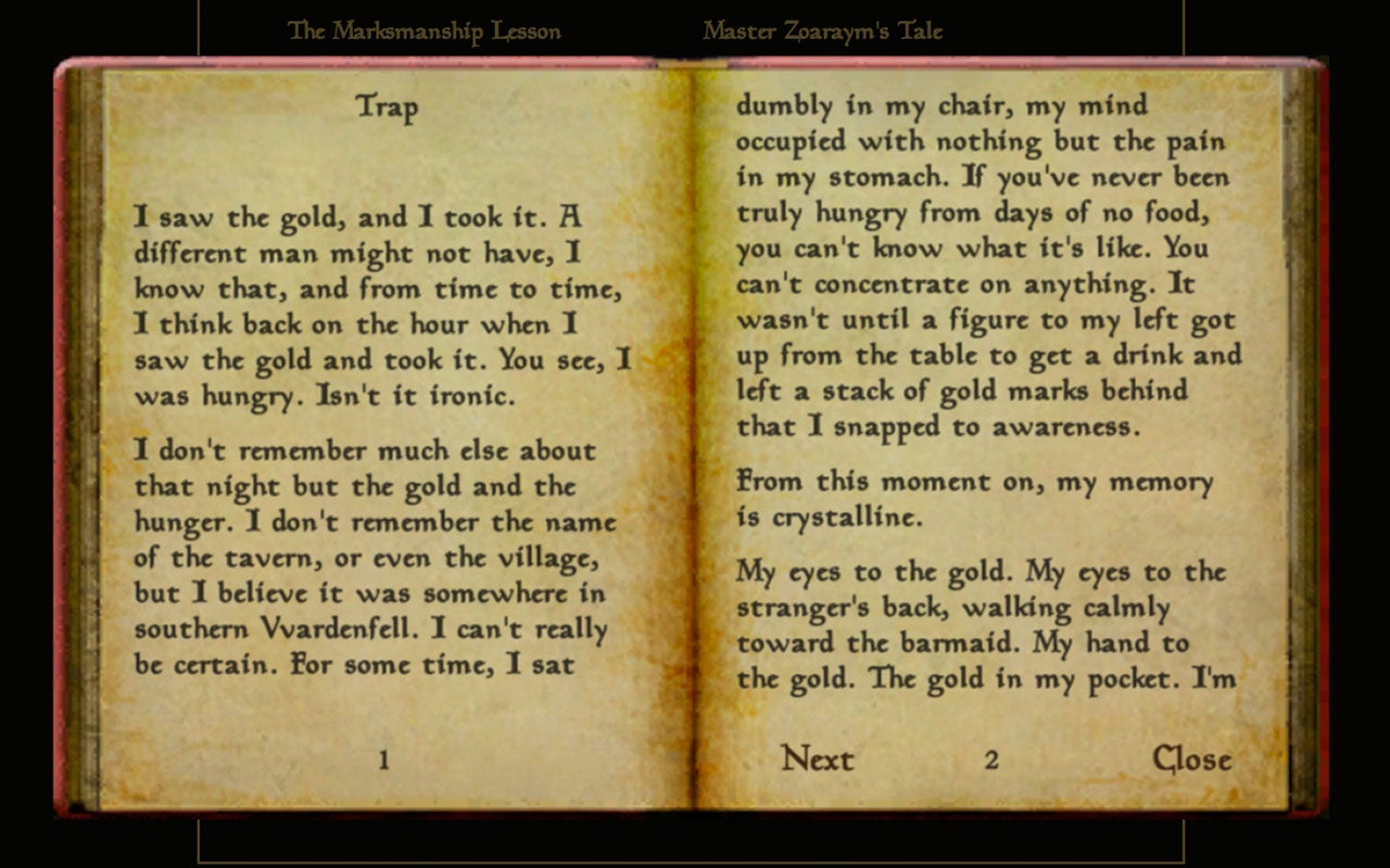 For Kirkbride, the path from the designer's brain to the player's eyes or ears might have grown more functional over the years, but he still feels that more game-writers should focus on two core maxims that served him well in his former role at Bethesda. For one thing, he and his fellow scribes decided very early on that each text the player would encounter in Tamriel would have a distinct author and point-of-view, rather than the "Word of God" soapboxing that tended to mar early CRPGs. Rather than simply taking a speaker or text at their word, this meant that players were encouraged to consider the point-of-view of the author, just like in real historiography.