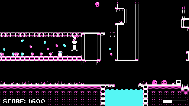 The limited palette is apparent in Scanline, but it shines in spite of its tight restraint. The color are bright neons, like of cyan and magenta. The player's character dashes forward, blasting away little snakes with their gun, as they navigate the game's procedurally generated levels. The scanline, once loved by players back in the day, is now hot on your tail, and might as well spell out defeat if it catches up to you.