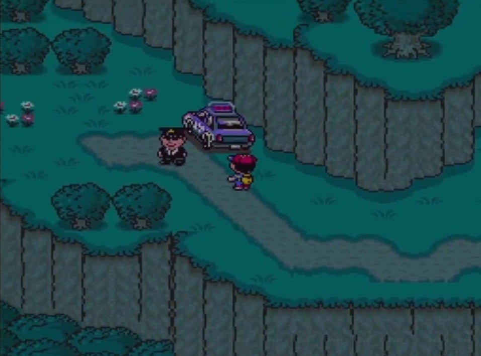 00:18--I leave the house. The main road is blocked by police, so it's time to explore the surrounding area, which also seems to be crawling with cops. One of them tells me I should stay away from the hilltop because it's dangerous, but then acknowledges the futility of his warning, saying he knows it won't stop me. I'm starting to suspect that either Earthbound has a very sly, self-aware humor about gaming clichés, or everyone in this town is conspiring to plot my demise. This game is either going to get really light and charming, or seriously dark and gritty.
