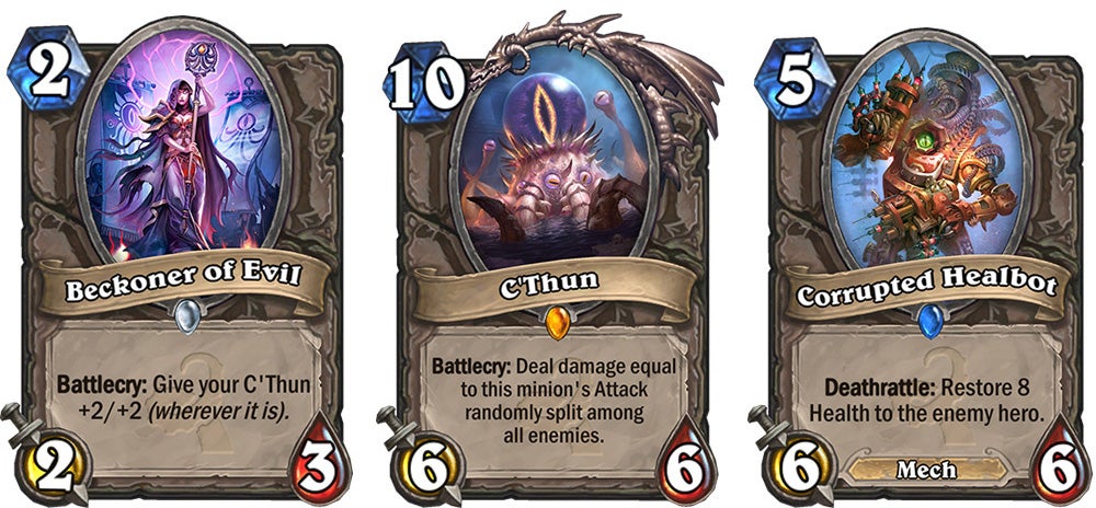 DA: Yeah, I think that's really cool. I was really really happy with the decision to do that, because it really stems from, we have this super super cool idea. You have all of these cards and they buff up this card, and you have the vision of building up this giant C'Thun. I don't know, it's really cool to build your own monster kind of thing. But the card's a legendary card, as it should be. It's C'Thun, he's an old god, it's the old god set, of course he's going to be a legendary. And we want all of those cards to interact with him, and they're going to be common and rare and maybe some epics. It feels pretty bad to open up a pack and it's three commons that interact with an epic that you don't have. So, for C'Thun specifically, we didn't go into Old Gods and say, to generate more interest, we're just going to give people a legendary. We have this really cool idea, and we thought that, you know what, it's going to feel really bad if you open up all these cards and you don't have C'Thun. So you know what, let's just give them C'Thun. We don't want to scrap this idea, we don't want people to feel like they can't build their deck because they're roadblocked because they don't have this legendary. We sat around and kind of talked about it, and it's like, "What if we just give them C'Thun?" You know what, we really liked that idea. So it's really cool that we, we came to that conclusion, it's like, "Yeah, let's just do that, it feels like the right thing to do."