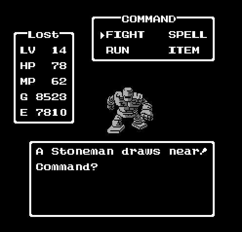 Moreover, dying in Dragon Warrior is a punishing ordeal. You're sent limping back to the game's starting point with half your gold, which is a major deterrent for players who just want to push ahead and see what's on the horizon. Other old school NES action games are also brutal, but they usually offer a straight shot to success via instantaneous power-ups and extra lives. In Dragon Warrior, the only way to get strong enough to defeat the Dragon Lord is by slowly and steadily building yourself up. You fight Slimes for scraps of gold, which you use to buy slightly more powerful weapons. Once equipped, you can take on the next tier of enemies and win more gold. It can take hours to get strong enough to beat the Dragon Lord.