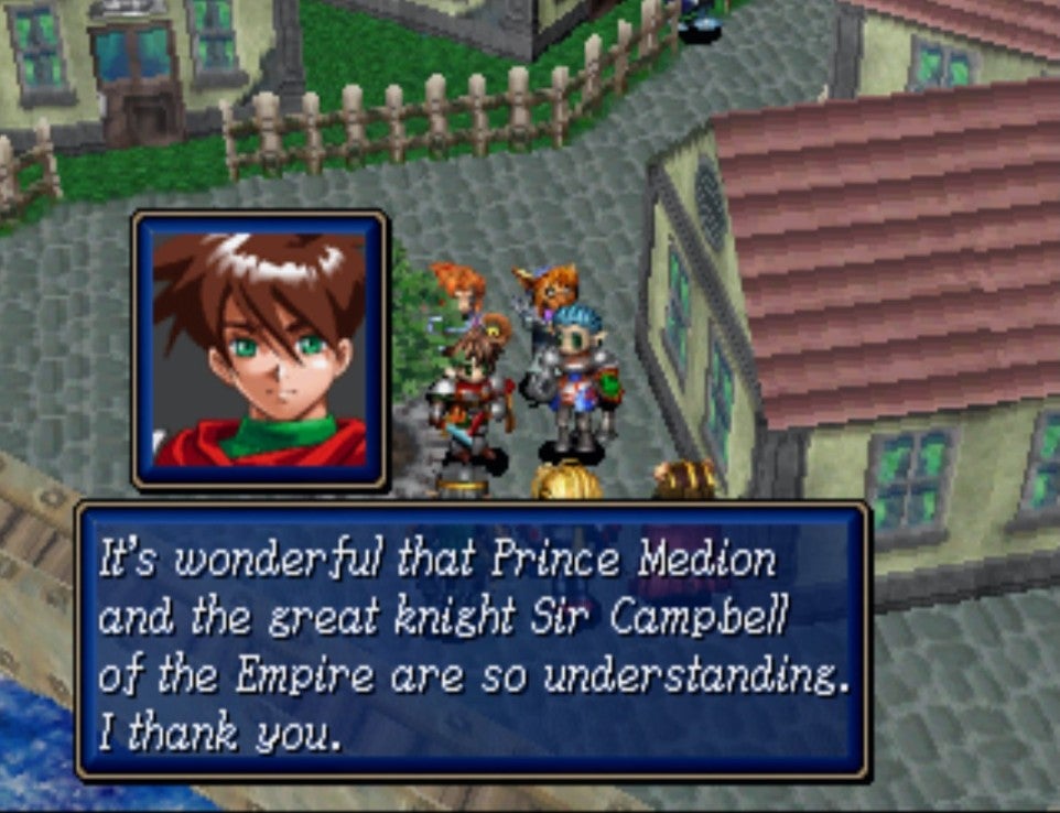 Set during the threat of war between the Republic of Aspinia and the Empire of Destonia (with both actually being manipulated by religious cult the Bulzome Sect), the first scenario had you playing as Synbios; a young lord from Aspinia. In the second scenario, you play as Medion, a prince of Destonia. You’ll see the same plot from different perspectives, or get a hint of a battle happening that then plays out in the other scenario, or you might save a character who then becomes recruitable in the next one. It's smart, and it knows it's smart. In both scenarios you also encounter a mysterious redheaded swordsman, called Julian, who actually emerges as the true protagonist in the third scenario – and its this flame-haired firebran who unites the other two forces in order to take on the real big bad. Not bad for a game that came out in 1998, right?