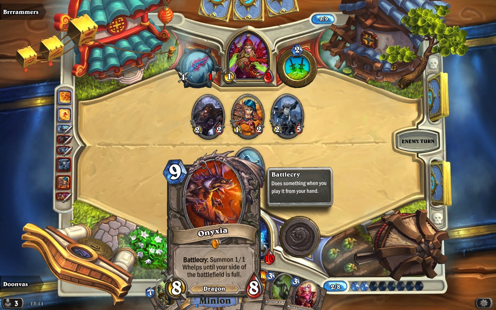 Okay, not all of them. After uttering her battlecry, she also plonks herself down on the board, and she's a beast: 8/8. (I call the seconds following all this the Pregnant Pause, incidentally, because I am classy like that.)