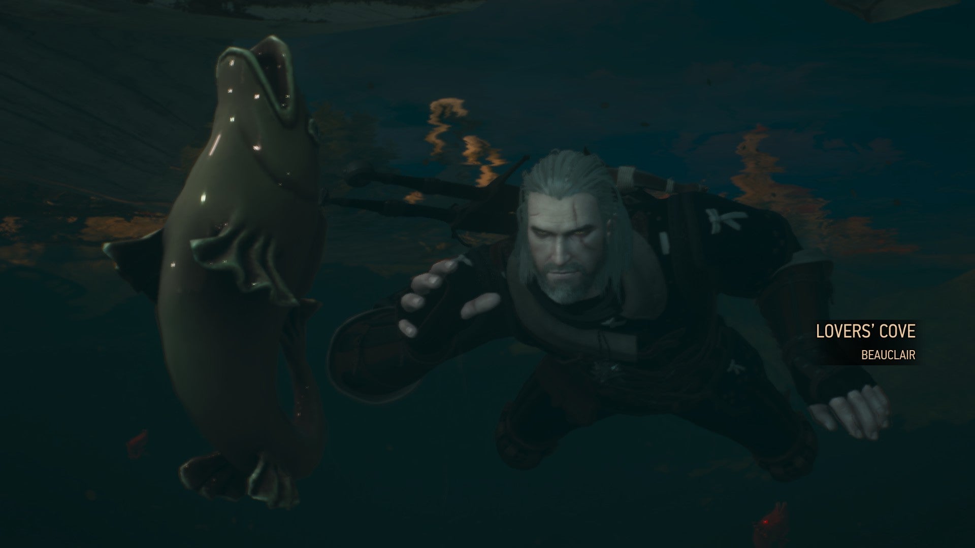 The "fish" are actually ceramic statues tethered to the button of the lake with chains, floating in place. There'll appear red when you use your senses, though not if you're too far away. Once close enough, you can search them like any other container. The fake ones will just have candy inside, but the real one should prompt a cinematic when you get close enough. The fish you want is in the one in the South-West, close to the beach. If you find it quickly, you'll get an extra 100 experience. Otherwise there'll be a brief clip where two other people get it first, then Geralt just snatches it off them. Either way, it's progress.