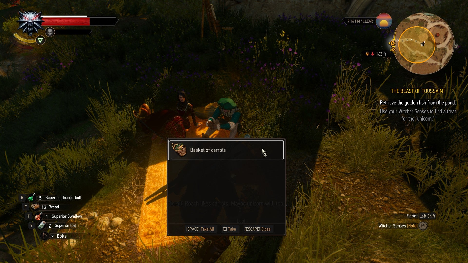 To catch it properly, use your Witcher Senses to find several people nearby having a picnic (the area to search will be marked on your map). Inspect the baskets around them until you find one filled with carrots or apples, then take it and equip it from your Quick Select Menu, like you would a crossbow or your spells.