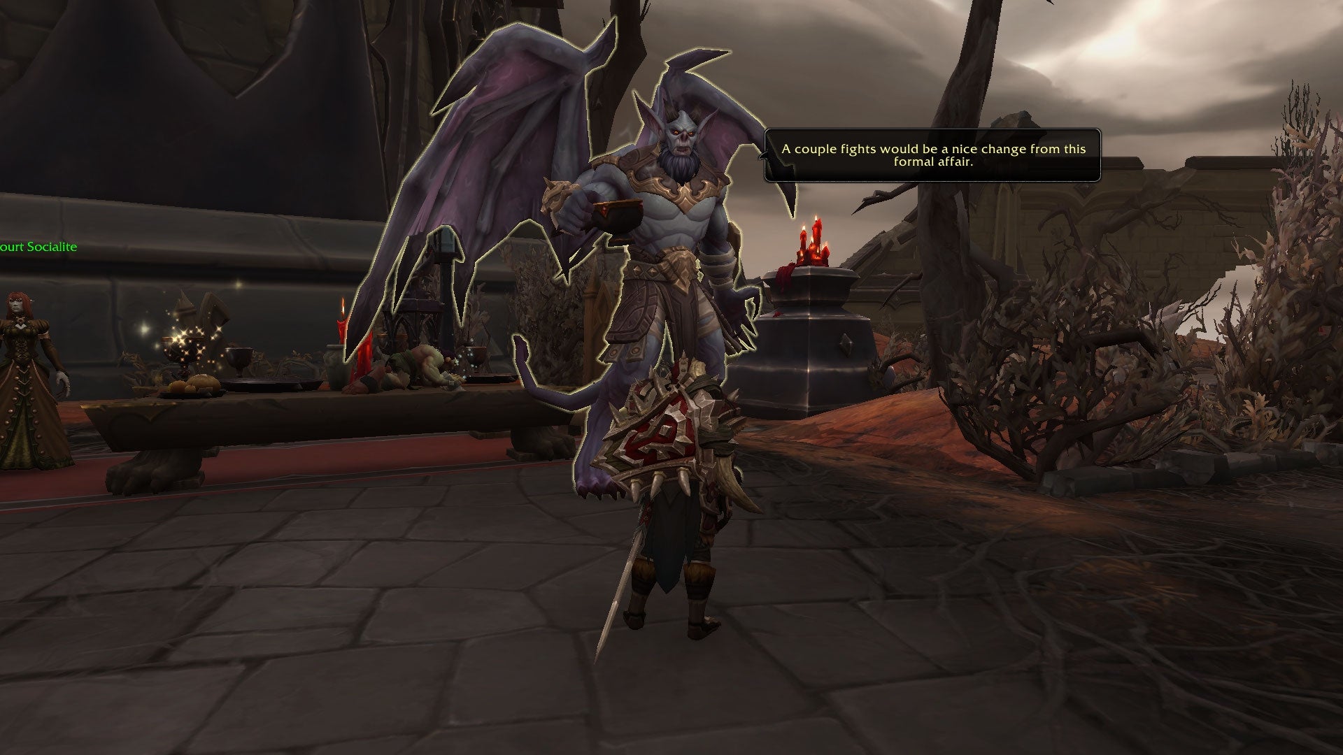 This is where things get weird, and it likely won't be everyone's favorite bit of WoW. See, the Court has an overall atmosphere that you have to balance within a certain period of time. Certain guests prefer one type of party, while others may fall in the other direction. For example, Theotar and Watchmaster Boromod are opposed forces, the former wanting a formal affair, while the latter prefers more casual gatherings. You push the court in either direction by serving piping hot tea, or picking fights with guests.