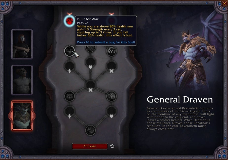 You can change your Soulbind at the Forge at any time, and there's no cost to doing so. Being a duelist, Nadjia's skills improve your damage and debuff your enemies. Stone Legion commander and gargoyle General Draven has bonuses focused on more health, armor, and strength, as befits his stature. Finally, Theotar the Mad Duke has skills focused on movement and buffing your character. In the preview server, I was able to unlock the full tree for Nadjia; on live servers, you'll need to gain Renown, a weekly objective resource, to move further down the tree.