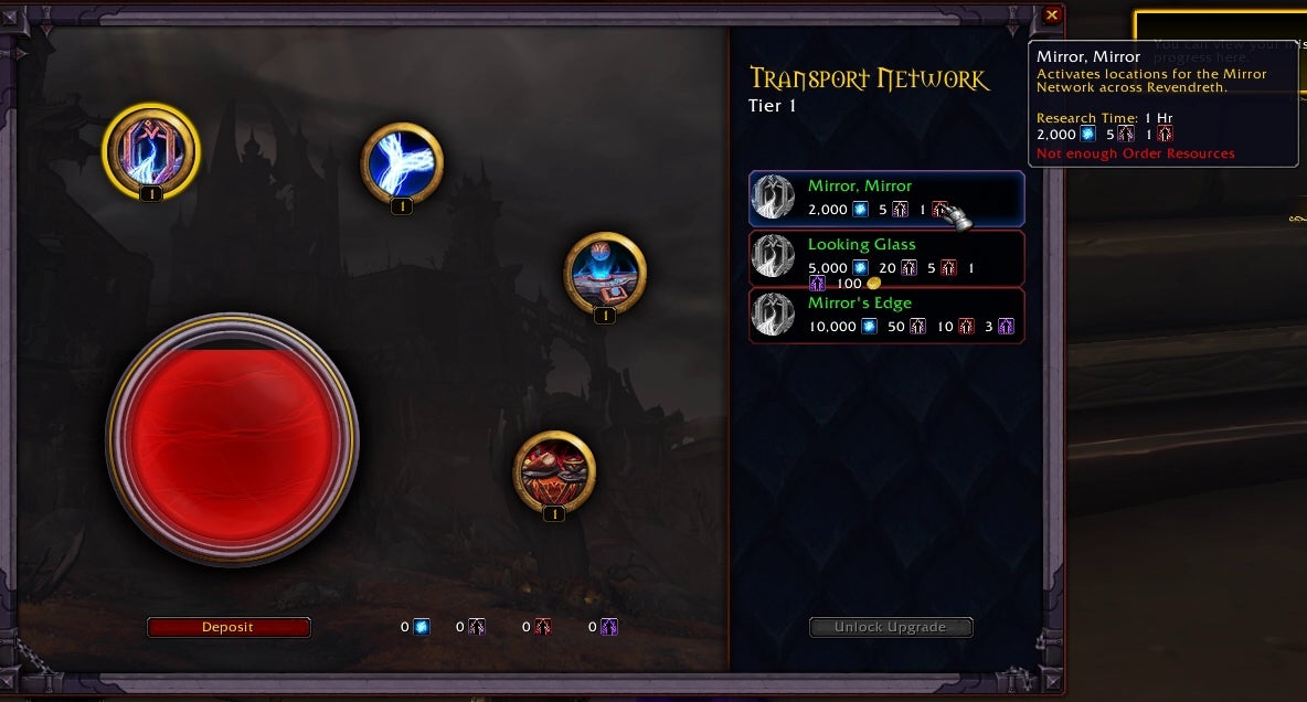 Behind Prince Renathal sits a squat little character named Foreman Flatfinger. This is the creature that will help you upgrade your Sanctum. The improvements come in four different areas. There's the Transport Network: in Venthyr's case it's a series of mirrors around Revendreth that you can teleport between. Hazzikostas points to this as a strong feature of Covenants, making you feel more comfortable playing in the region specific to your Covenant.