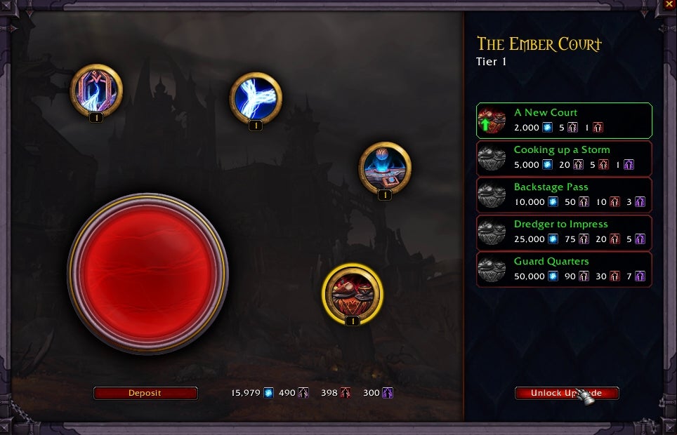 The Anima Diversion section increases the number of Anima Conductors you can unlock. The new mission system, Adventures, are unlocked and improved in the third section. The final section is the Ember Court, a section that will be unique to each Covenant. The Ember Court is a vampire-style soiree with drinks, gossip, and art installations of tortured souls, but other Covenants's versions will take different forms. ("It's a hosting venue for pretty rad parties," said Hazzikostas during the recent developer update.) The other sanctums are the Kyrian's Path of Ascension, the Necrolords' Abomination Factory, and the Night Fae's Queen's Conservatory.