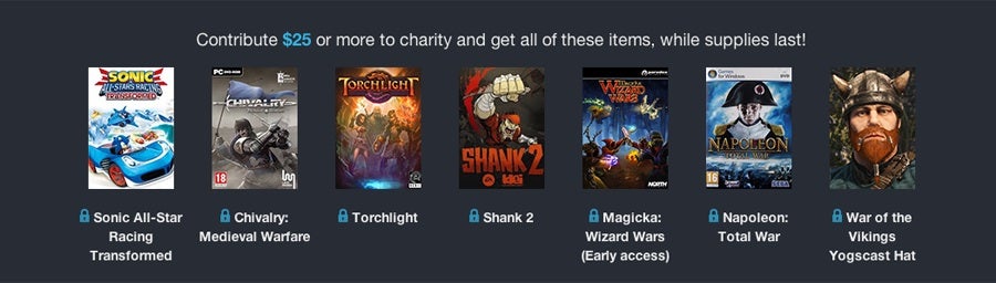 If you're able to give $25 ($5 each for the five worthy causes) you'll also receive the following PC games and content: