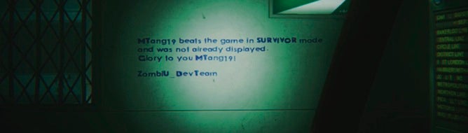 ZombiU's Survival mode is so hard that Ubisoft Montpelier almost thought it was unbeatable - but at least nine brave souls have done it. As captured by Kotaku, Ubisoft has hidden messages in-game celebrating those who've achieved the difficult feat. Is your name on a wall somewhere? Do share. ZombiU is out now in the US and arrives with the Wii U launch in Australia and Europe this week.